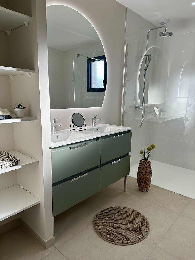 - Une salle de bain (Espace Aubade) avec double vasque, douche italienne et baignoire